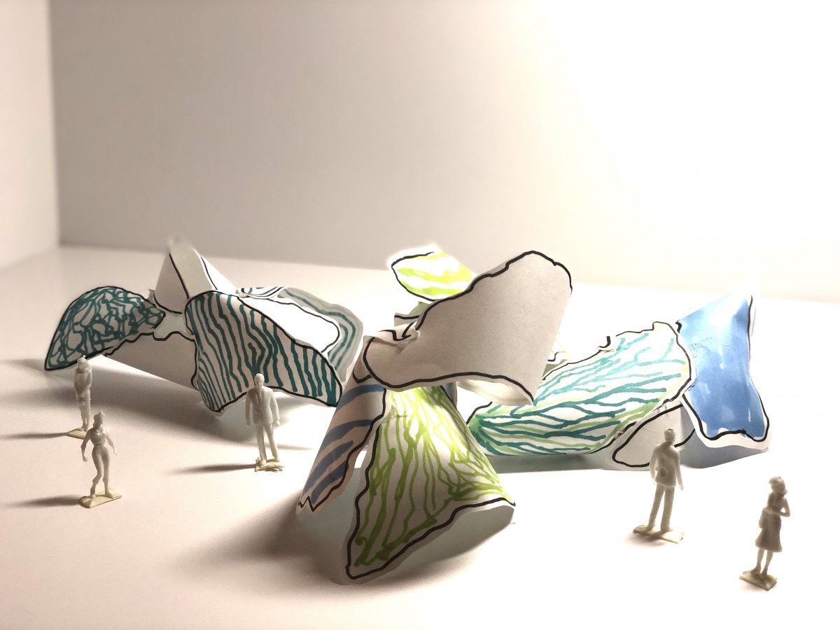 I took shapes that I found from the Chelsea physics garden and drew them out with makers on paper and did mark making on them, afterward I cut them out and play around with the shapes I got. I learned this experiment during the first term of the foundation course in fashion class. This could be the shape for a shelter, I included some human figure in order to show the size and possible use for this space.